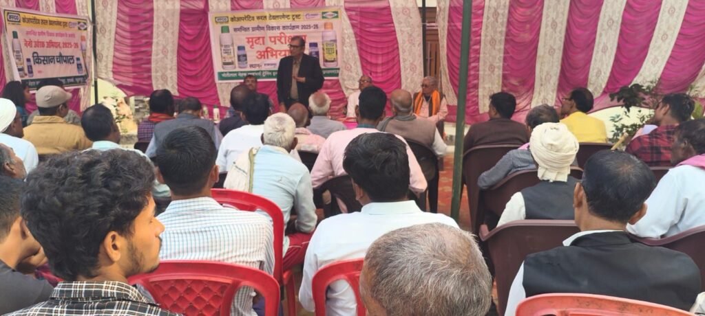 आज दिनांक 23.11.2025 को मृदा परीक्षण अभियान 2025-26 के तहत कारडेट फूलपुर द्वारा चयनित गांव हरभानपुर में किसान चौपाल एवं मृदा परीक्षण अभियान का आयोजन किया गया। इफको के वरिष्ठ कृषि वैज्ञानिक डॉ० के ० एन० तिवारी ने किसानों को मिट्टी की जांच के लाभ के विषय विस्तार पूर्वक चर्चा की साथ ही साथ मिट्टी में आ रही विभिन्न सूक्ष्म तत्वों की कमीयों पर भी प्रकाश डाला । इसके साथ किसान भाइयों को नैनो यूरिया प्लस और नैनो डीएपी के प्रयोग के विषय में विस्तार पूर्वक जानकारी दी, और उन्होंने बताया कि दानेदार यूरिया व डीएपी की मात्रा आधी कर खेती की लागत कम कर सकते हैं, इसके साथ मृदा स्वास्थ्य एवं अपने स्वास्थ्य को बेहतर बनाया जा सकता है । उनके द्वारा मिट्टी के स्वास्थ्य पर पढ़ रहे दुष्प्रभाव पर चिंता व्यक्त की गई और समय रहते इसमें सुधार कर लेने का सुझाव दिया गया। उनके द्वारा एक प्रगतिशील किसान श्री कृष्ण कुमार तिवारी के द्वारा नैनो डीएपी से शोधित कर बोई गई सरसों की फसल का अवलोकन किया गया। उपस्थित कृषकों एवं वैज्ञानिकों ने सरसों की फसल को देखकर अपनी संतुष्टि व्यक्त की।